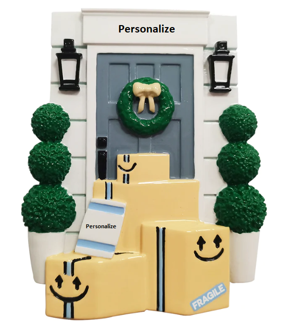 This adorable Doorstep package ornament is perfect for any person who is ALWAYS getting deliveries! The white space above the door and any of the packages can be personalized with any wording.