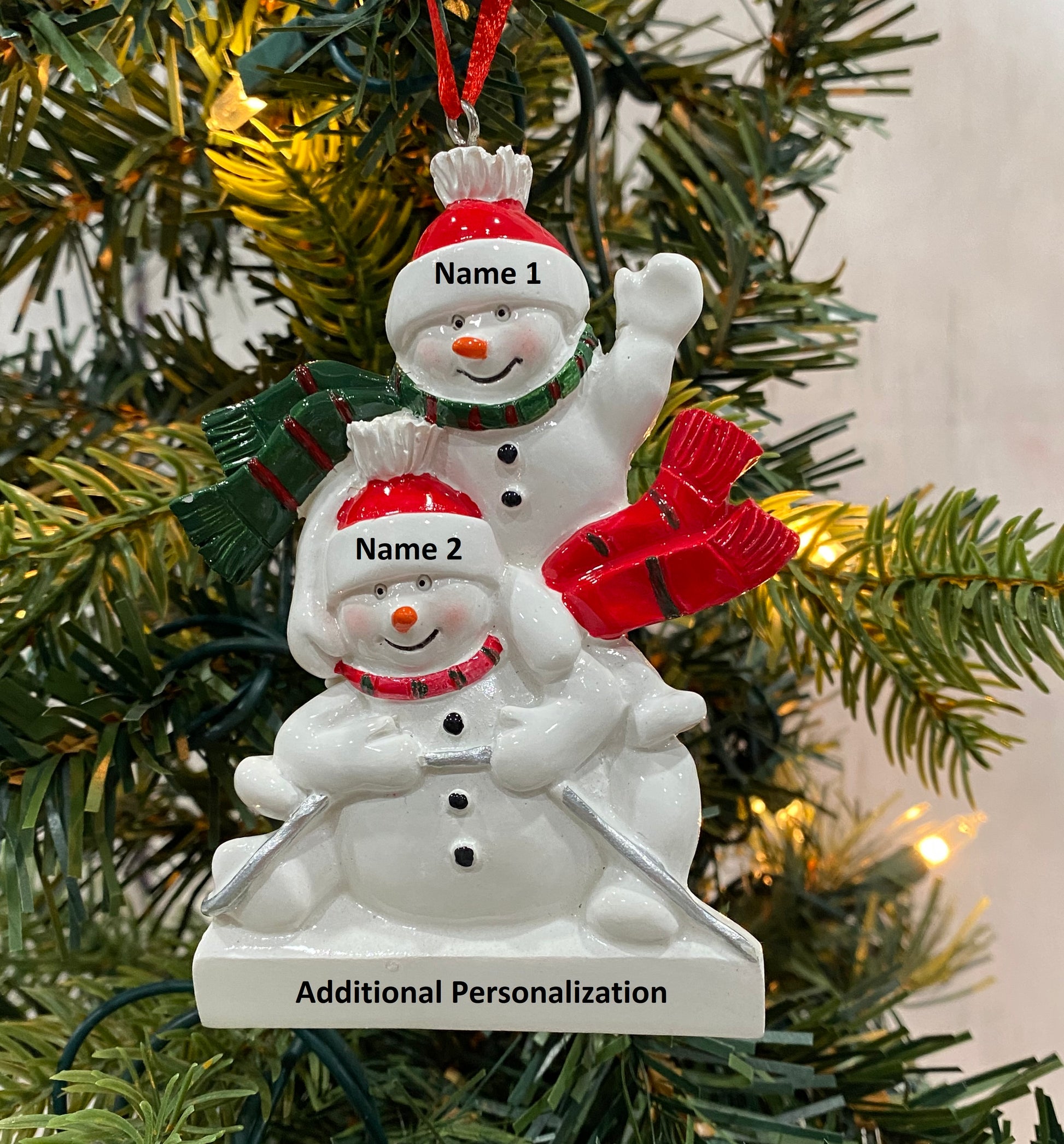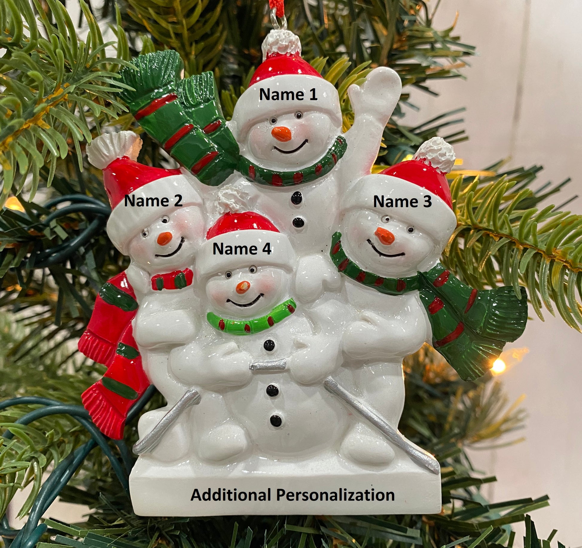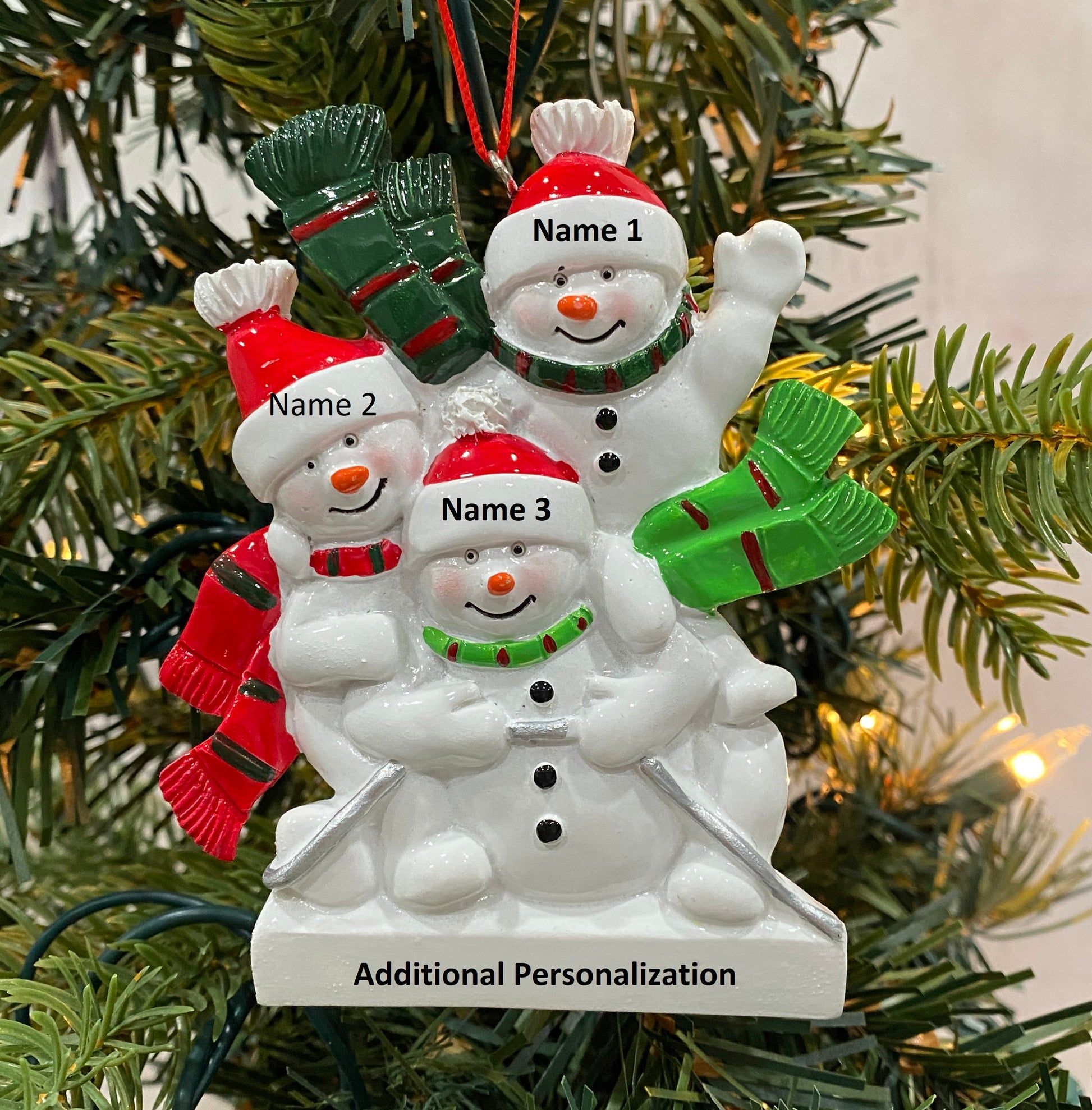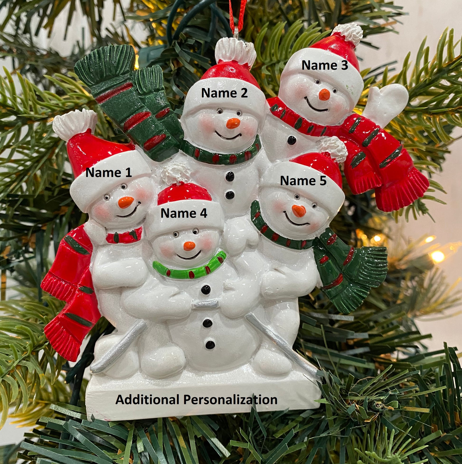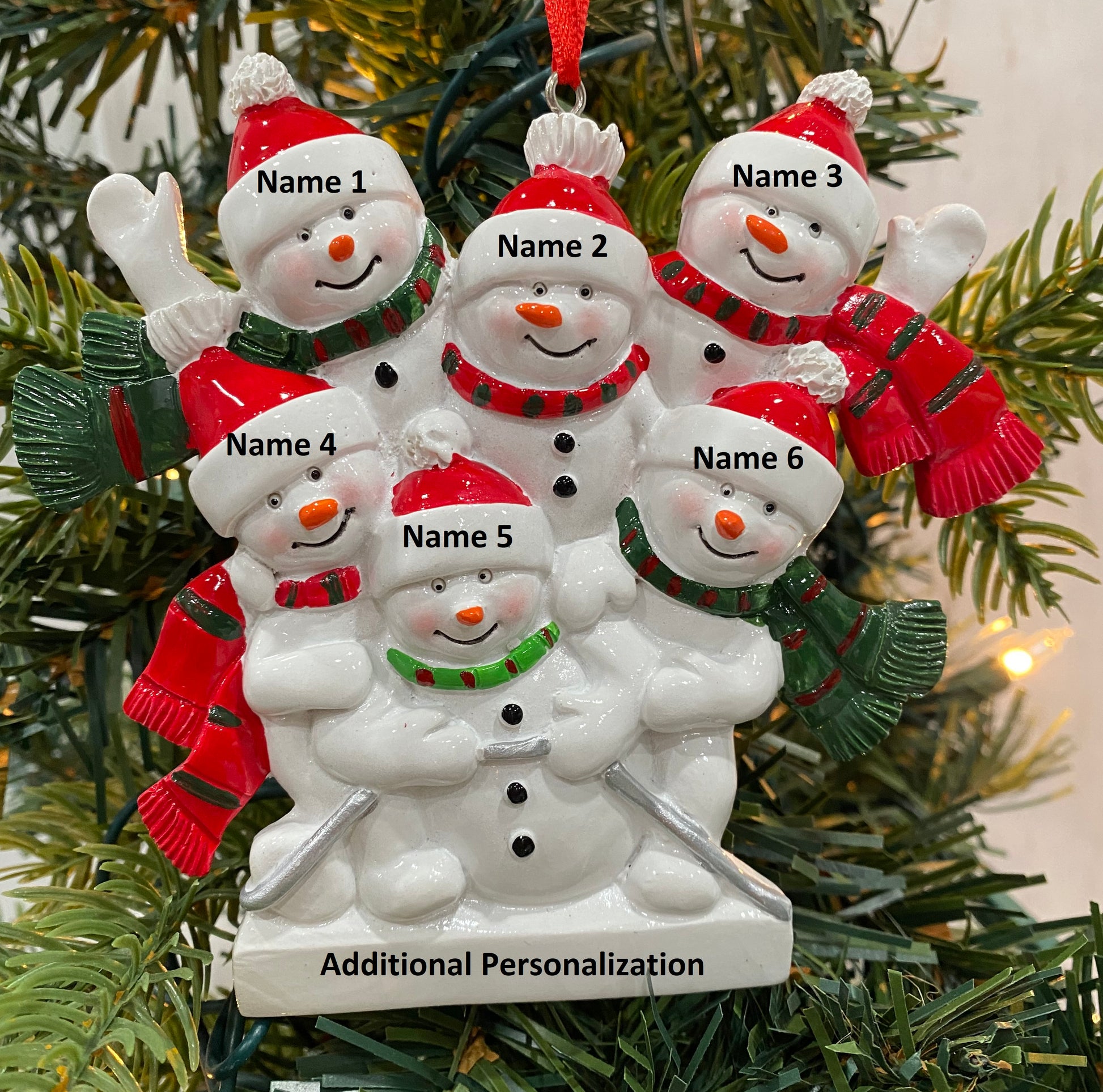 This adorable Snowman Sled Family Ornament is available in a family of 2, 3, 4, 5, or 6. The Snowman hats and bottom can be personalized.