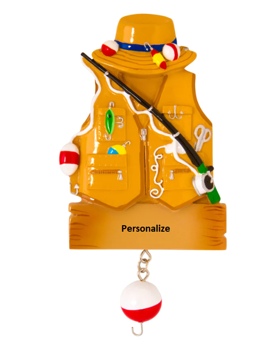 This adorable fishing vest is perfect for any fisherman or fisherwoman. The banner under the vest can be personalized with any wording.