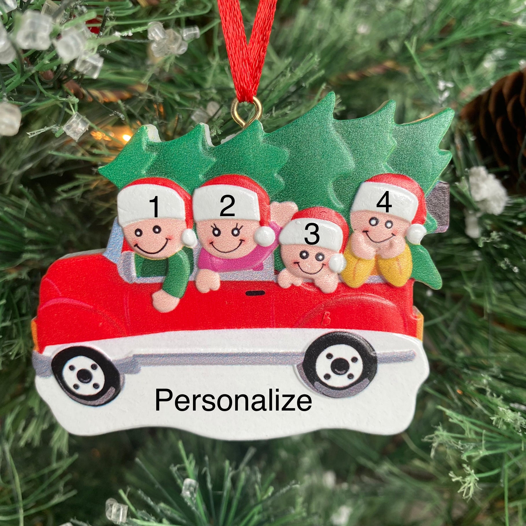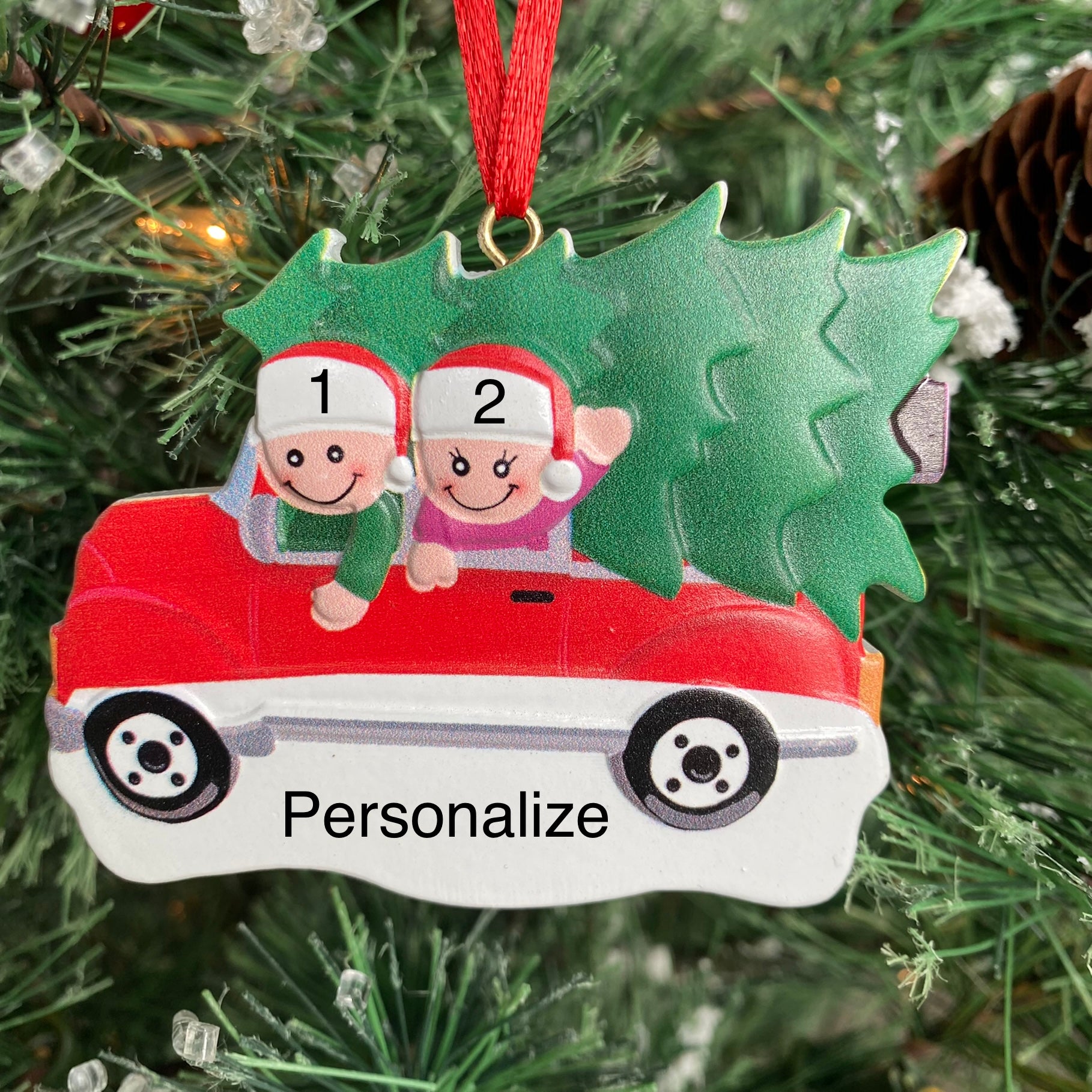 This adorable resin Christmas tree on a car family ornament is available in family of 2, 3, or 4.
